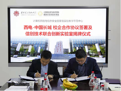 接着,杨力主任和曹泽伟总经理共同签署了“校企合作协议书”,万波副经理则与曾林方董事长为“西电-中国长城信创技术联合创新实验室”揭牌。