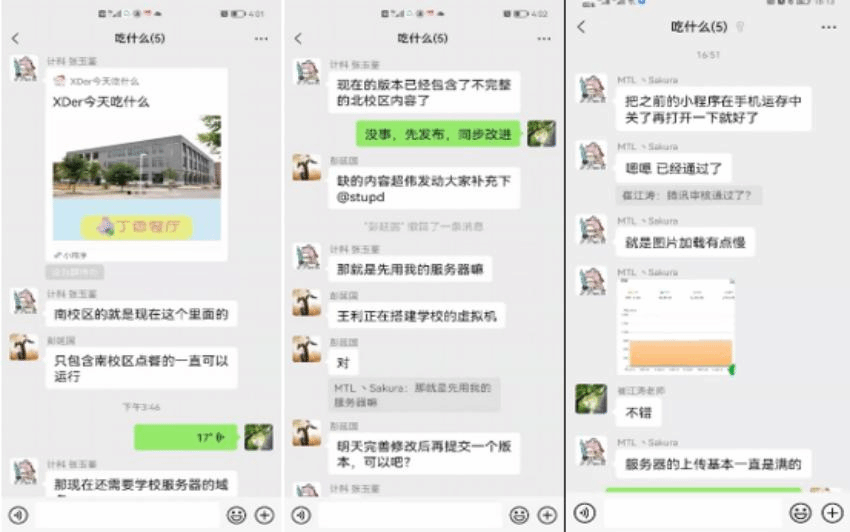 针对小程序运行之初,访问带宽受限、并行处理能力弱、小程序发布审核时间久等问题,tyc33455cc崔江涛教授、彭延国副教授带领研究生一起帮助张玉鉴加班加点提供解决方案,设计了支持高并发的部署方案,统筹协调计算中心开辟了专用虚拟服务器资源,争分夺秒完成了应用迁移,同时联系腾讯公司加速小程序审核,确保了“XDer今天吃什么”小程序及时发布。目前云选餐服务可以正常使用,后续将根据同学们的建议进一步完善相关功能。
