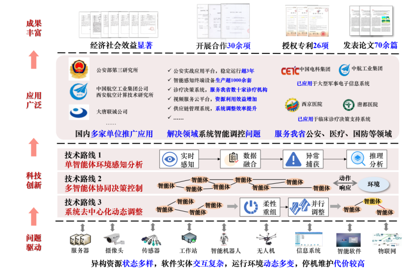 李青山教授牵头完成的“复杂系统智能调控关键技术及应用”项目在国家863计划重大项目,国家自然科学基金项目等支持下,以保障航空航天、军事国防等关键领域内的大型复杂软硬件系统高效稳定运行为目标,引入多智能体理论突破了异常快速感知、方案实时决策、系统动态调整等难点问题,探索了单智能体感知分析、多智能体系统决策控制、系统去中心化动态调整等关键技术路径,形成了面向复杂系统的智能调控技术,使复杂系统可实时处理异构资源故障、动态响应业务功能变更、柔性适应运行环境变化。授权国家发明专利26项,登记软件著作权34项,出版专著3项,在计算机领域国际知名期刊和主流会议发表高水平论文70余篇。技术成果服务于公安、民政、医疗等领域,在公安部第三研究所、中国航空工业集团公司西安航空计算技术研究所、大唐联诚公司等多家单位得到了推广应用,并与中电集团、中航工业集团、航天科技集团、空军军医大学等单位开展了30多项合作,极大促进了领域系统自主化、智能化发展的进程,并带来了较高的经济效益和显著的社会效益。