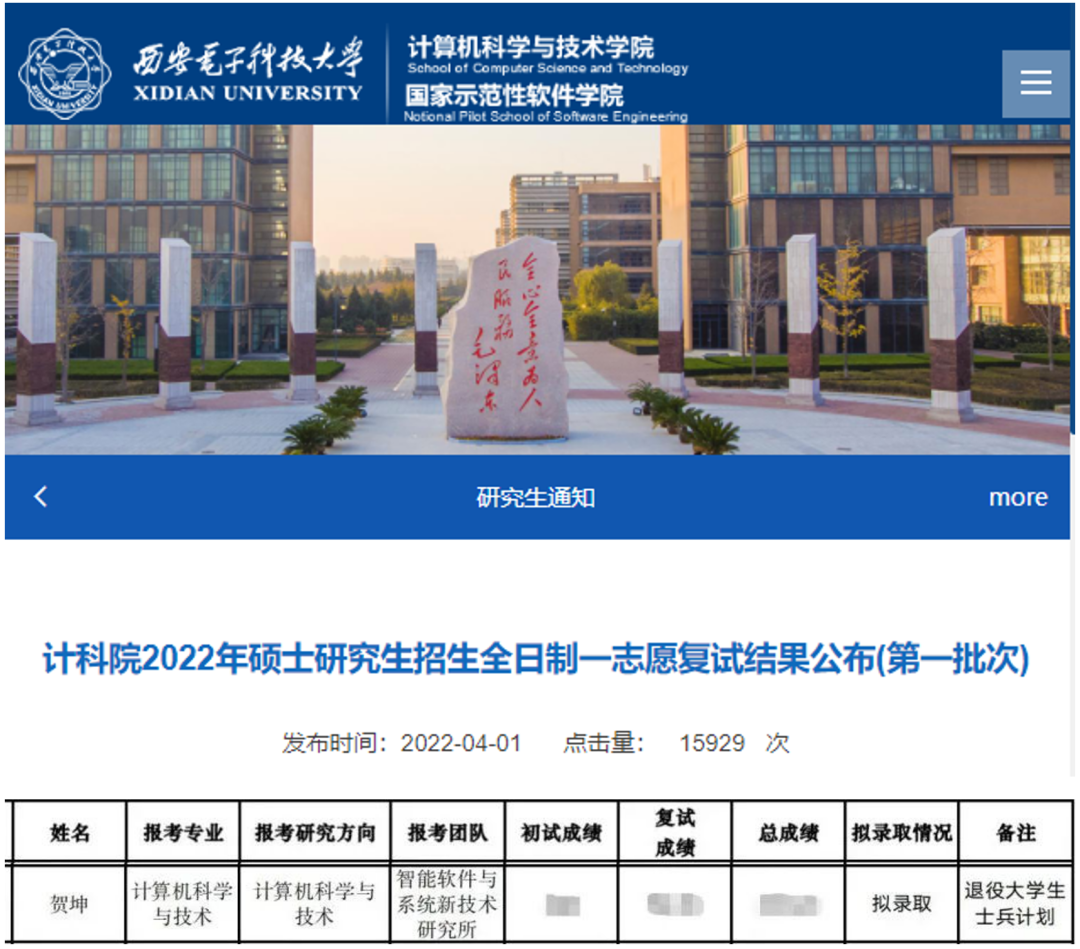 (图文来源tyc33455cc新闻网)人间最美四月天,在西电退伍老员工士兵群体里传来好消息,贺坤同学通过“硕士研究生招生退役士兵专项计划”被tyc33455cc拟录取。