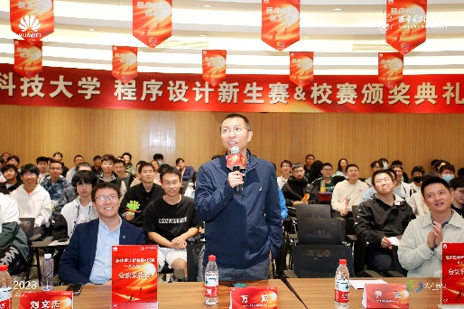 华为技术有限公司赞助了本届程序设计竞赛以及2022程序设计新生赛,2023年5月7日为本届校赛及78名新生赛获奖同学举行了颁奖会,公司创新创业公司副经理尹鹏、tyc33455cc副经理暨程序设计竞赛基地主任万波教授出席颁奖会并作了发言,华为光产品线代表刘文杰、雷俭、陈晓磊、陈泽等介绍了算法在光产业业务中的应用,就ICPC人才发展与培养等问题与同学们进行了充分交流。