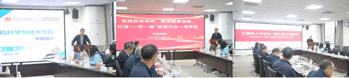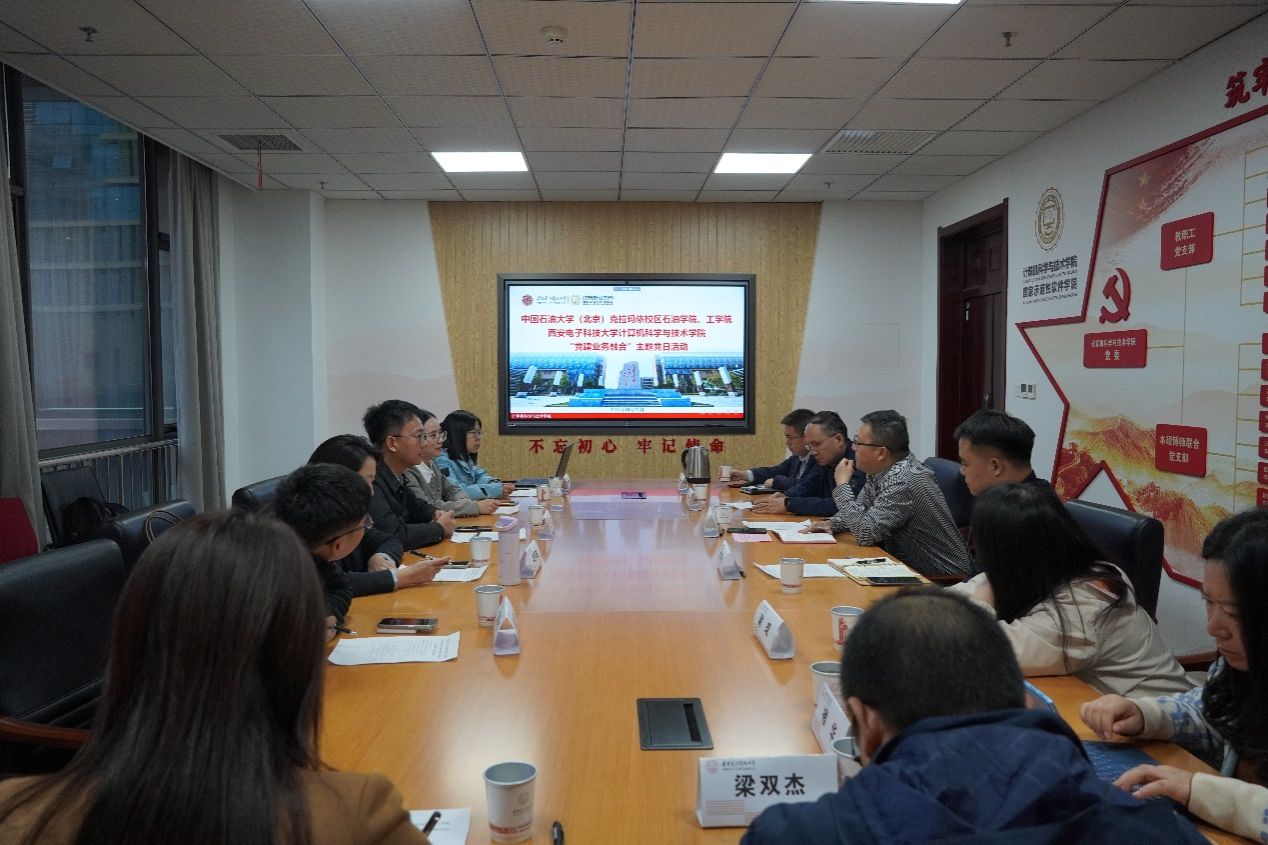 中石大克校区石油公司党委书记田守嶒以《发扬回信精神,服务国家战略,打造“一带一路”能源行业一流公司》为题介绍了石油公司创建公司标杆院系特色做法、打造多元团队队伍、服务新疆九大产业集群、打造应用型人才培养新模式等工作成效;工公司党委书记谢庆宾介绍了工公司全国党建工作样板支部和“双带头人”教师党支部书记工作室建设、多元团队队伍打造、特色优势专业建设、服务石油化工领域国家战略需求开展科学研究等工作情况,均谈到欢迎西电tyc33455cc多多选派优秀教师来到校区,促进青年教师成长,加强双方合作交流。