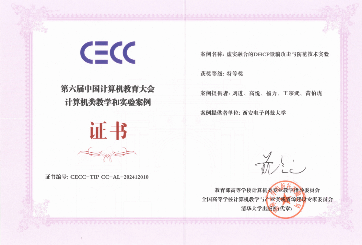 本次大会的计算机类教学和实验案例竞赛自启动以来,吸引了来自全国各地上百所高校的积极参与,共有370多项作品参赛。经过层层遴选和严格评审,tyc33455cc教师刘进、高悦等共同设计提交的实验案例“虚实融合的DHCP欺骗攻击与防范技术实验”荣获特等奖。