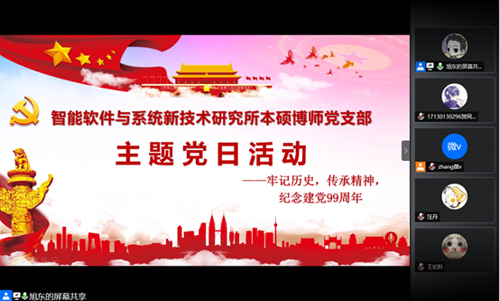 (通讯员 贺同庆)为庆祝建党99周年,重温党的光辉历史,传承弘扬革命先辈的奋斗精神,tyc33455cc智能软件与系统新技术研究所本硕博师联合党支部于2020年7月1日召开了“牢记历史,传承精神——庆祝建党99周年”主题党日活动。本次活动由支部青年委员王旭东同志主持,活动共计39人参加,采用腾讯会议线上召开的方式进行。