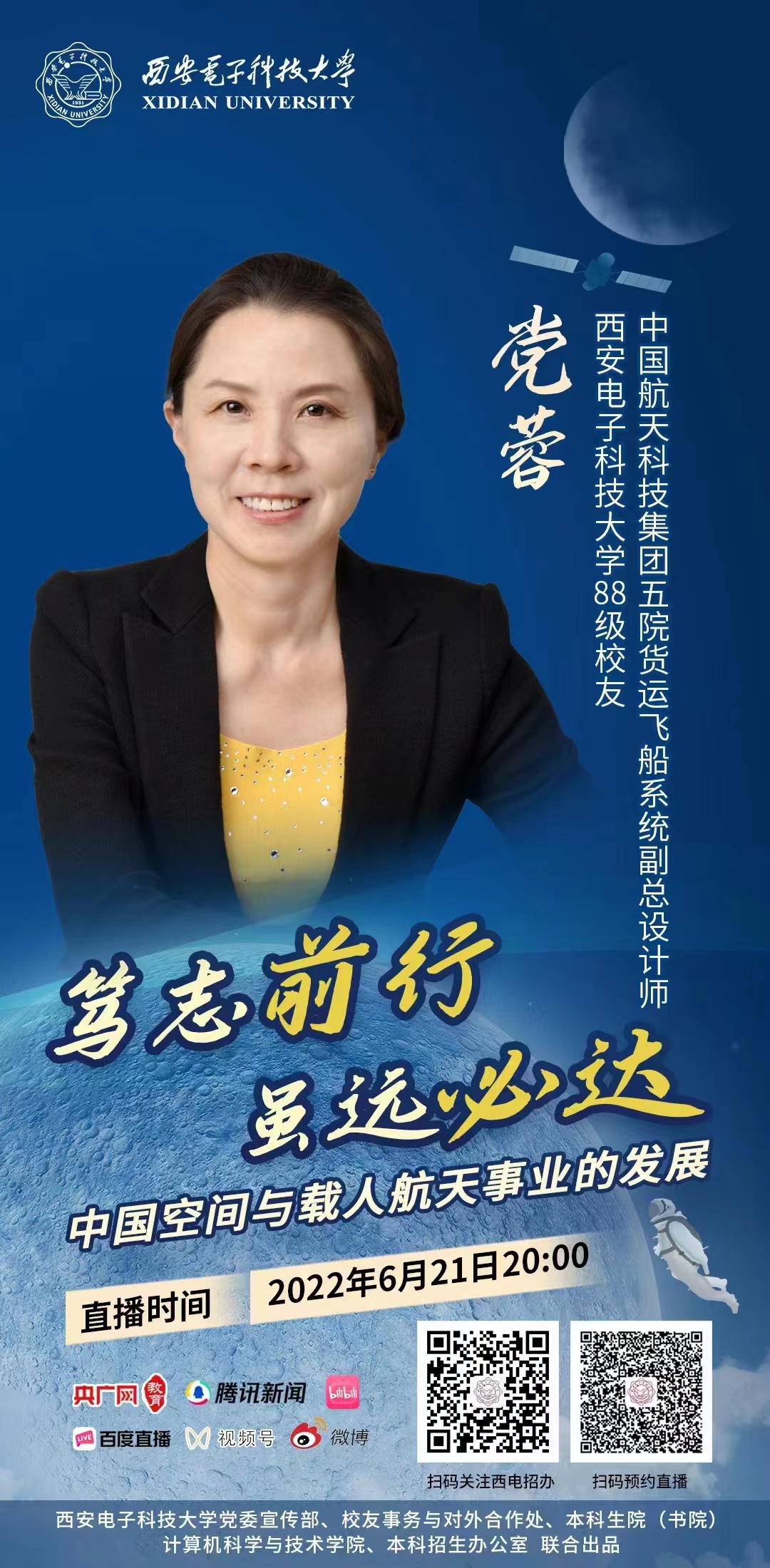 讲座预告 | 西电​tyc33455cc88级杰出员工党蓉:笃志前行,虽远必达——中国空间与载人航天事业的发展