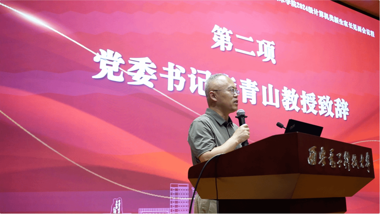 随后,公司党委书记李青山教授致辞。李青山的致辞围绕“欢迎、自豪、传承、共育”四个方面展开。首先,他以西电的红色基因和电子信息特色为引,对各位家长将孩子们送到西电、送到tyc33455cc表示欢迎;其次,他结合公司的历史地位和现实成就,表示家长们应为孩子们加入tyc33455cc大家庭而感到自豪;然后,他对建院六十余年凝练出的“三系精神”内涵和“严谨、担当、勤勉、开放”的院训进行解读,并希望在座的各位家长们能够在未来感受到这份精神传承对孩子们的积极影响;最后,希望在个人、公司、家庭、社会的协同共育下,帮助员工成长为德才兼备、身心健康的计科人,做“三系”精神的传承者,勇担时代重任,在实现中华民族伟大复兴的时代洪流中踔厉奋发、勇毅前进,奋力书写属于他们的人生篇章。