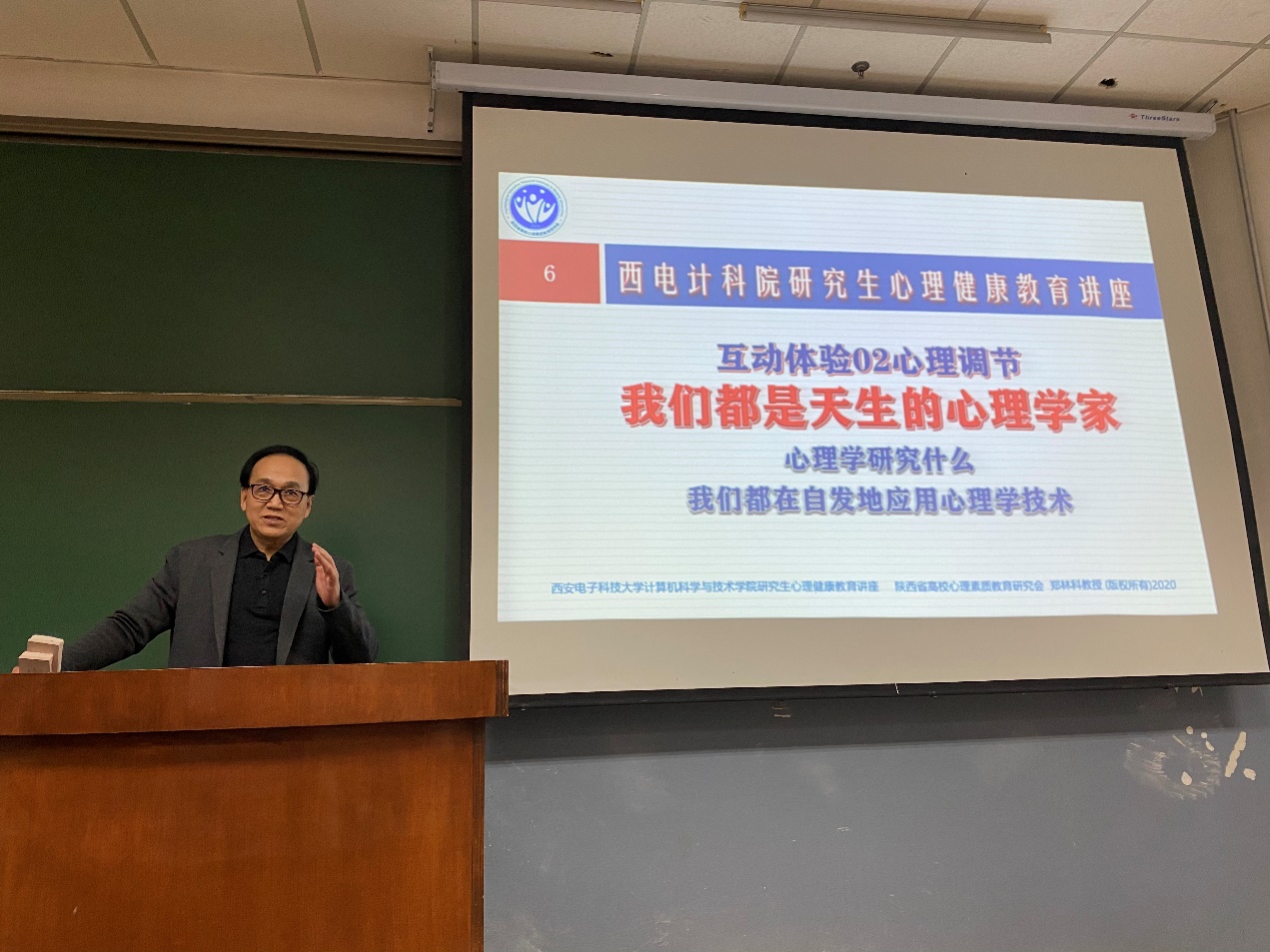 讲座开始,郑教授首先组织大家进行手指操的训练,这一小小的活动,很快地激发了同学们的热情。随后,郑教授从心理学给人健康、心理学使人幸福、认识生命承受之重、管理压力信念调节等方面,通过互动体验问题,带领大家进入心理科学殿堂。他以压力为主题,介绍了心理学研究的六个方面——认知、情感、意志、行为、人格和人际关系以及心理学的四个功能——认知自己、成为自己、疗愈自己、繁荣自己,使大家对心理学有了初步的认识。紧接着,从我为自己健康把个脉的自测活动开始,郑教授为大家重点介绍了30多种心理自测、压力识别以及压力调节等方法,以及如何正确使用这些心理学方法让自己感到更加阳光、快乐和幸福,并与现代医学理论相结合,讲述了心理学能够减小压力、使人幸福背后的原理。通过郑教授的讲解,同学们更为细致的了解了心理学,也从诸多互动中了解自我,认知自我,更是学习到了压力调节的诸多方法。