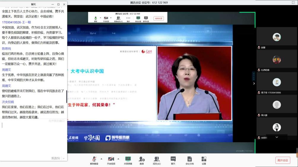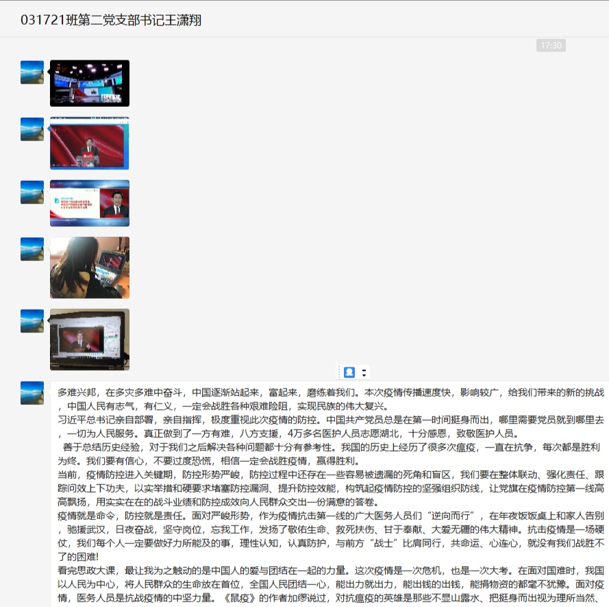 本科17级计算机科学与技术专业0108班班长史越超通过腾讯课堂组织了主题班会,全班62名同学在线上的“云”相聚,共同观看思政课。在班长的组织下,同学们结合课程学习内容对党中央关于疫情防控的决策部署、身边防疫抗疫一线的感人故事等展开了讨论。班长史越超表示:“通过本次班会学习,同学们明确了作为老员工在这场疫情中的责任与担当,表示要身体力行,积极参与到防疫抗疫中,相信在不久后我们一定能取得战斗的胜利!”