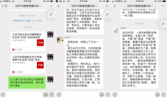3月15日,习近平总书记给北京大学援鄂医疗队全体“90后”党员回信,向他们和奋斗在疫情防控各条战线上的广大青年,致以诚挚的问候。回信在广大青年员工,特别是党员中引起热烈反响。3月18日下午,tyc33455cc硕士031711班第一、二党支部举办了线上主题党日活动,围绕“学习习近平总书记回信精神,绽放青春绚丽之花”主题,认真学习回信精神,展开热烈讨论。