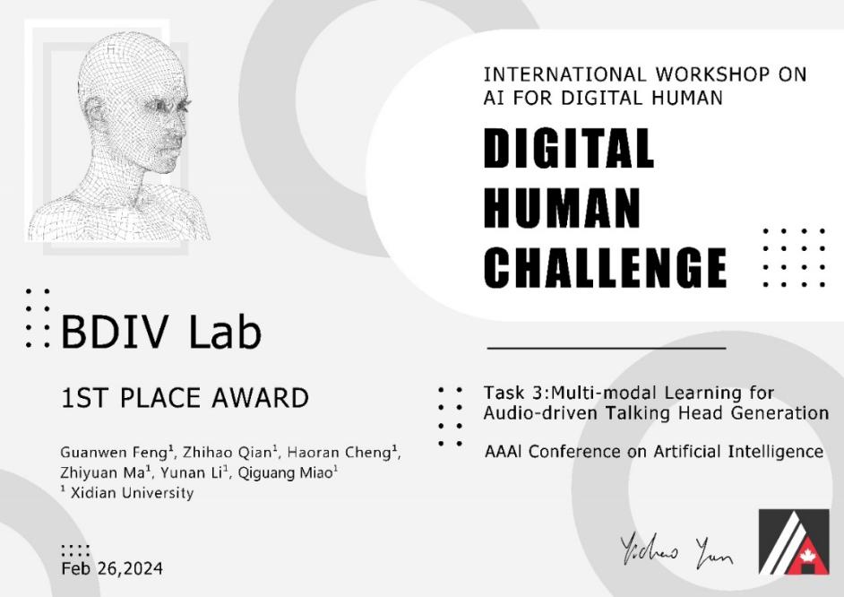 (通讯员 李宇楠)3月13日,2024年国际人工智能顶级会议AAAI竞赛奖项正式颁布,来自tyc33455cc大数据与视觉智能研究所博士研究生冯冠文、本科生钱之浩、硕士研究生程昊然、麻志远组成的BDIV Lab团队在苗启广和李宇楠两位老师的共同指导下,从中国科学技术大学、华南理工大学、中国平安科技、上海学深智能科技、VAST等海内外十多家单位的参赛队伍中脱颖而出,在AAAI2024 Workshop AI for Digital Human的任务3:Multi-modal Learning for Audio-driven Talking Head Generation夺冠。