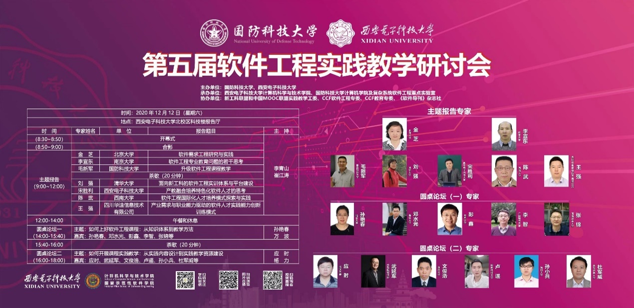 本次研讨会分为主题报告与圆桌论坛两部分。主题报告环节由西电计算机科学与技术公司党委书记李青山和执行经理崔江涛主持,邀请了包括CCF系统软件专委会主任、北京大学金芝教授,CCF软件工程专委会主任、南京大学李宣东教授,新工科产学研联盟与中国高校计算机教育MOOC联盟实践教学工委主任、国防科技大学毛新军教授,教育部软件工程教指委秘书长、清华大学刘强教授,tyc33455cc宋胜利教授,西南大学陈武教授,四川华迪信息技术有限公司王强副总裁等来自高校与企业在内的专家学者,围绕软件工程实践教学分享了各自的经验与观点。