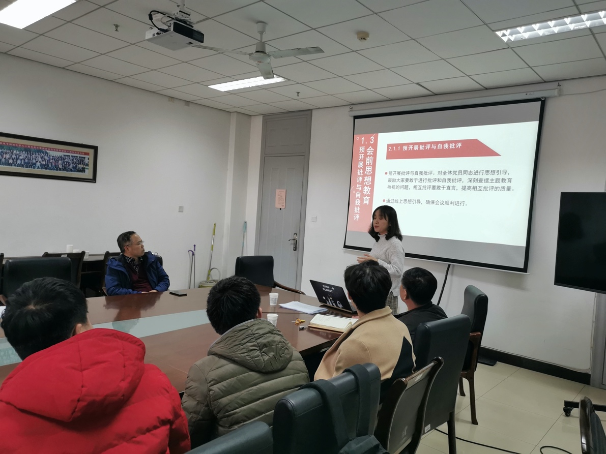 会议第二阶段,由组织委员刘肯东同志代表支部说明会前组织学习、谈心谈话等情况。她谈到,按照西电党组[2019]26号文件要求,2019年12月初期,本科2016级软件工程第一党支部组织支部党员以线下学习、交流讨论等方式学习领会习近平总书记关于加强党的政治建设等指示精神,紧扣“不忘初心、牢记使命”主题,重点学习《习近平关于“不忘初心、牢记使命”论述摘编》等重要书籍,跟进习近平总书记在出席庆祝中华人民共和国成立70周年系列活动时的重要讲话;通过会前谈心谈话,支部成员们肯定了主题教育活动的重要意义并认真反思自身存在的不足。