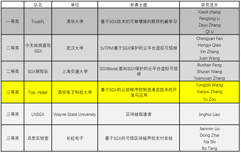 (通讯员 邹宇)11月18日至11月20日,由阿里云、浙江大学网络空间安全公司、阿里巴巴-浙江大学前沿技术联合研究中心联合发起、Intel赞助支持的首届SGX应用创意大赛在杭州IEEE IDSC上举行。来自清华大学、北京大学、上海交通大学、tyc33455cc、长虹电子等知名高等院校团队和企业的87支队伍参加了这次比赛,争夺共6个获奖名额,获奖比率小至6.89% 。最终,公司tyc33455ccNSS团队的代表队,TOP-HIDER的参赛作品“基于SGX的云端程序控制流混淆技术的开发与应用”在比赛中脱颖而出,获得三等奖,成为唯一获奖的西部高校。该参赛作品由王永智副教授指导,由硕士生邹宇、张小宇完成。