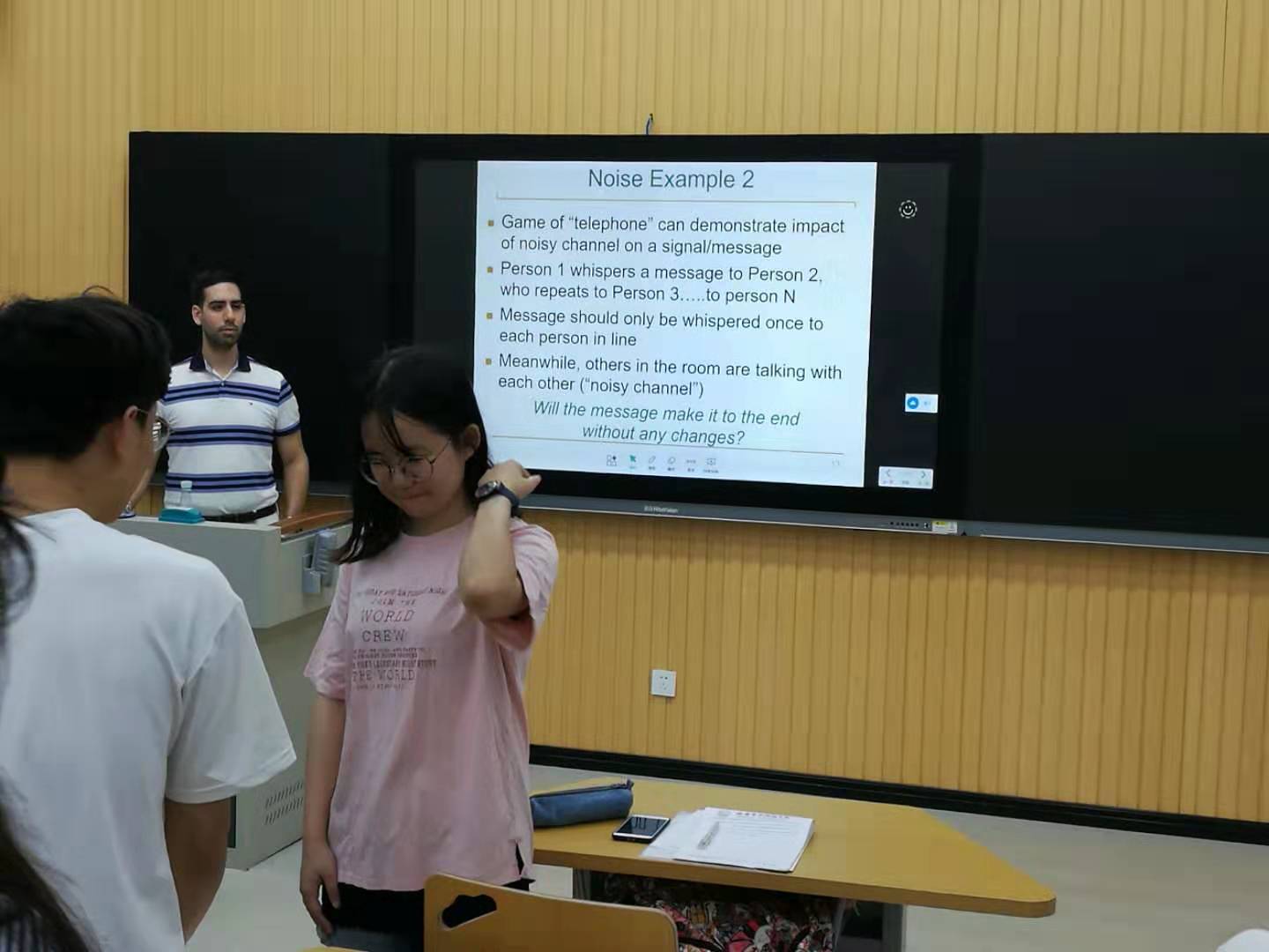 员工对这门课的兴趣很浓,原本只能容纳30人的智慧教室,吸引了很多前来旁听的员工,外教瞬间被员工的热情所感染,东西方思想的火花在这里开始碰撞。该课程使同学们最大感受是“自由,开放,参与,互动”。“国内”在教学方式上更多以老师讲授为主,员工处于被动地位,课堂氛围较沉闷,教学方式较单一。此次,外教则更多注重员工学习知识时的体验过程,课堂上更多采用分组探讨,活动与游戏等方法传授知识。该门课程使人印象最深的是外教讲授“噪声对信息传输的影响”时和员工开展的一个游戏。在这个游戏中,外教首先低声细语地告诉第一个员工一条信息,接着第一个员工再低声细语地告诉第二个员工,……。整个过程中,其他员工大声地交流来干扰信息的传递,直到最后一个员工收到信息。结果发现最后一个员工收到的信息与外教初始传递的信息竟然有很大的出入。员工通过该游戏,全程参与到老师课堂教学活动中,这种形式的教学,形象,生动,员工对课堂内容理解深刻,从避免了教学的枯燥乏味,员工注意力容易分散等问题。
