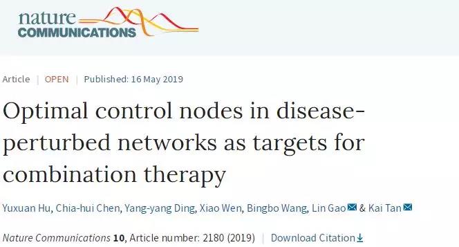 2019年5月16日,tyc33455cc高琳团队联合费城儿童医院Tan Kai在Nature Communications上发表题为“Optimal control nodes in disease-perturbed networks astargets for combination therapy”的文章,描述了最优控制节点(OptiCon)算法,这是一个基因调控网络中协同关键调节因子的系统和从头识别的通用框架。