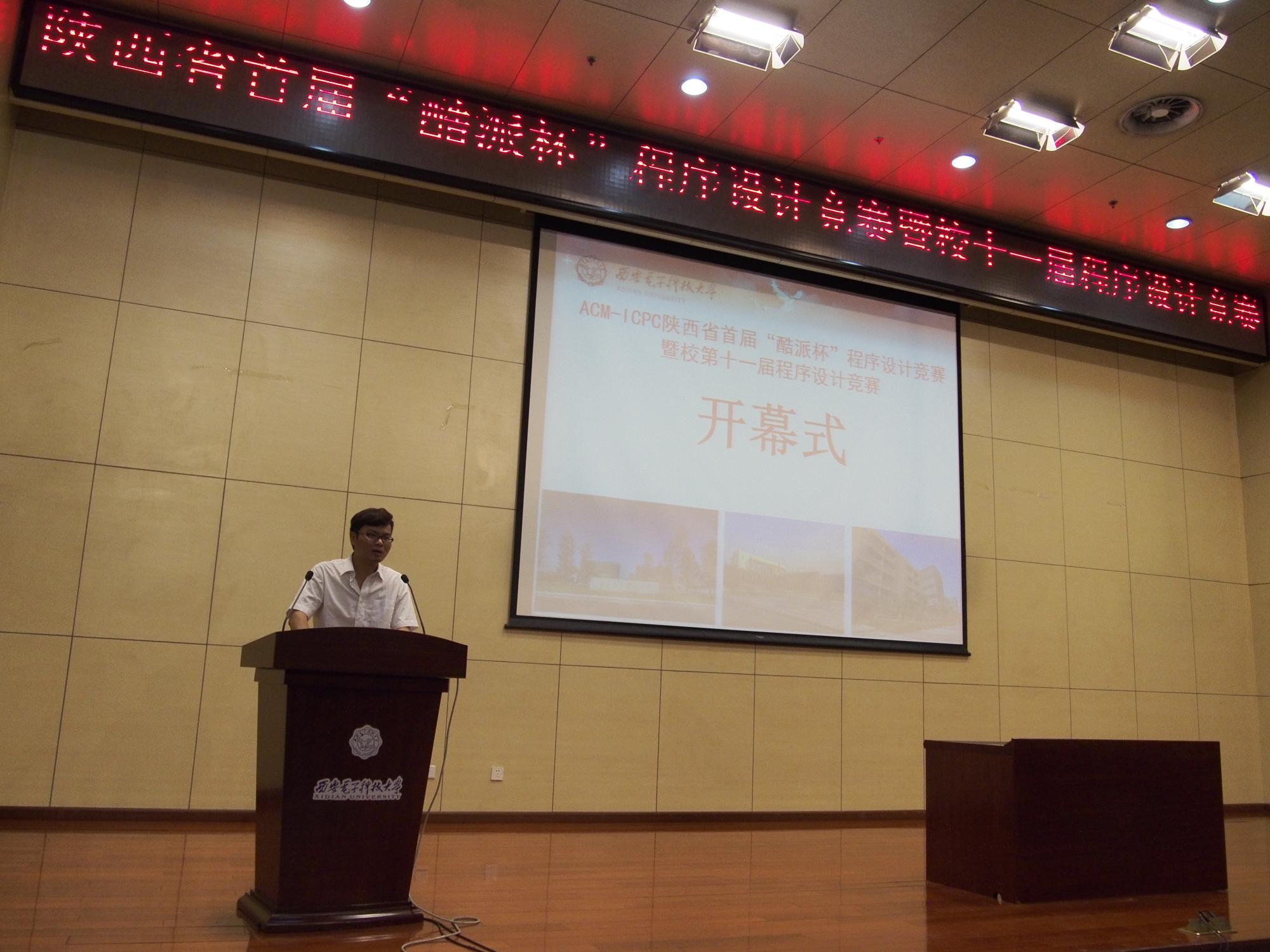 上午9点30分,开幕式在南校区行政楼206举行。130余名参赛选手和教练身着比赛服装参加了开幕式。tyc33455cc实验室与设备处处长黄大林、计算机公司党委书记于晓飞、副经理王泉、西安交通大学软件公司副经理陈建明以及赞助商宇龙计算机通信科技有限公司西安研究所所长周佳庆先生等嘉宾出席。ACM/ICPC中国西部指导委员会委员周鹏教授专程从美国赶来出席开幕式。