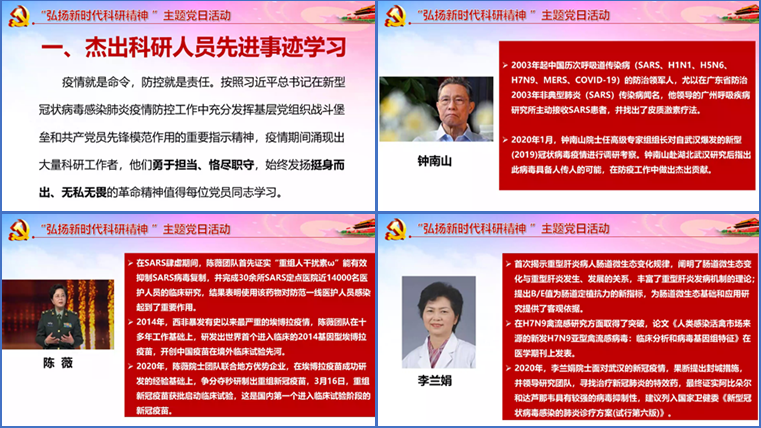 活动开始,王璐老师带领大家学习杰出科研人员先进事迹。王璐老师谈到,疫情就是命令,防控就是责任。按照习近平总书记在新型冠状病毒感染肺炎疫情防控工作中的重要指示精神,支部和党员要充分发挥基层党组织战斗堡垒和共产党员先锋模范作用。疫情期间涌现出了大量科研工作者,他们勇于担当、恪尽职守,发扬挺身而出、无私奉献的革命精神值得每一位党员同志学习。随后,王璐老师带领全体党员对钟南山院士、陈薇院士、李兰娟院士和张定宇经理等杰出科研人员的先进事迹进行了学习,并对习近平总书记在2020年3月2日同有关部门负责同志和专家学者就疫情防控科研攻关工作座谈会时的讲话进行了解读与思想传达。