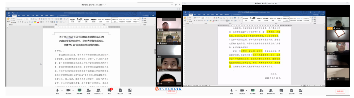 (通讯员 刘泽宇 孙煊溢)新冠肺炎疫情爆发以来,广大医护工作者、奋斗在疫情防控各条战线上的工作者披荆斩棘、勇挑重担,为坚持打赢疫情防控总体战不遗余力。3月15日,习近平总书记给在首钢医院实习的西藏大学医公司员工、北京大学援鄂医疗队全体“90后”党员回信,向他们和奋斗在疫情防控各条战线上的广大青年,致以诚挚的问候。回信在广大青年员工,特别是员工党员中引起热烈反响。4月3日晚上7点30分,tyc33455cc硕士031712班第一、二党支部通过线上会议方式举办了“青年不惧风雨、抗疫勇挑重担”主题党日活动,认真学习习近平总书记回信精神,并开展热烈讨论。