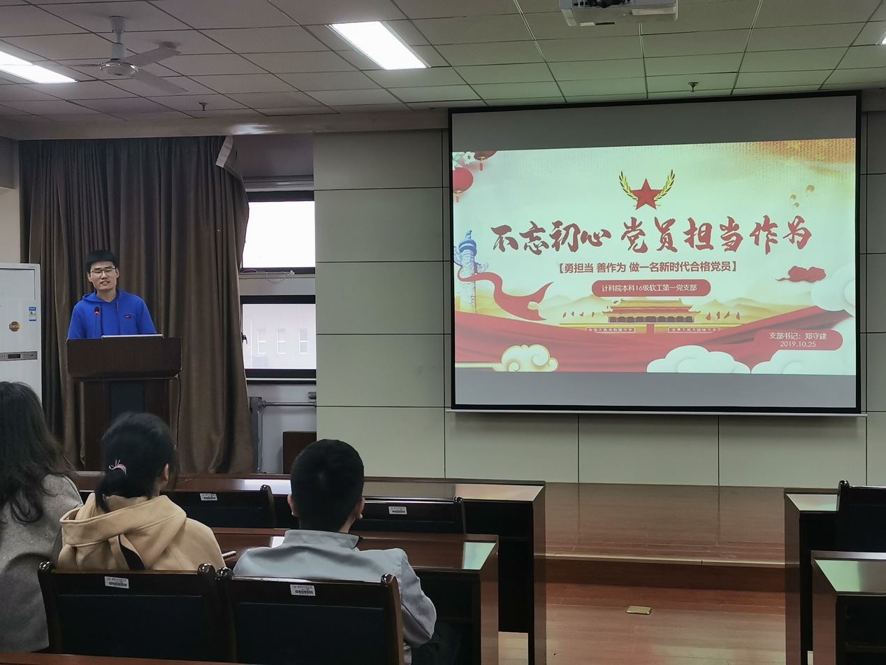 (通讯员 曹佳妮)习近平总书记在十九大报告中指出,要在全党开展 “不忘初心、牢记使命”主题教育活动,用党的创新理论武装头脑,推动全党更加自觉地为实现新时代党的历史使命不懈奋斗。中共中央决定从6月开始,在全党自上而下分两批开展“不忘初心、牢记使命”主题教育活动。10月25日下午五点,tyc33455cc本科2016级软件工程第一党支部在G楼516开展“不忘初心、牢记使命”主题教育党课活动。活动由支部书记郑守建主持。