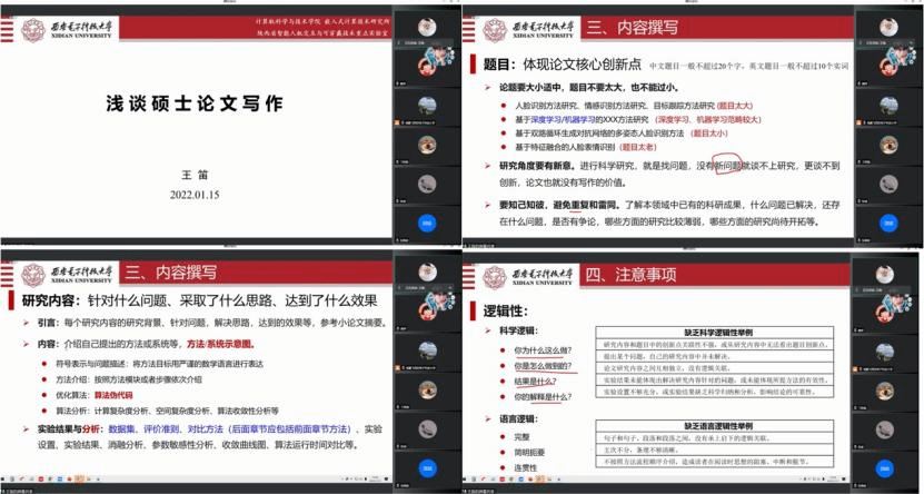 2022年1月8日举办的“研究生论文选题”在线研讨活动,正值2020级研究生论文开题之际,为员工科研方向梳理、开题报告撰写提供了切实指导,受到所内师生热烈欢迎。随后,1月15日下午,研究所又恰逢其时地开展了“研究生毕业论文撰写”在线讲座,邀请王笛副教授主讲,分享研究生毕业论文撰写经验与心得。本次活动由嵌入式计算技术研究所本硕博师第一、二联合党支部、计算机工程系党支部发起,旨在提升研究生学位论文质量,是促进公司人才培养的切实举措。