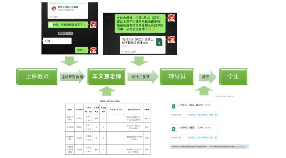相信在线上学习的这段时间里,所有同学最熟悉不过的就是签到了吧。每节上课前,老师都会让我们签到,或是雨课堂签到,或是腾讯课堂签到,或是学在西电签到……签完到之后不久我们就会收到辅导员发来的信息,某月某日正式上课考勤结果统计表。车文惠老师在这一整套工作中起到枢纽作用,她就像一座桥梁,衔接老师、辅导员和员工,从而保障员工们都可以认真听课。她每次会提前一天做好第二天的考勤表,在第二天上课前发给老师们,然后23点左右统计一天40~50门课程的的平均到课率、未签到员工名单和原因,及时反馈给辅导员,让辅导员来督促未上课的同学准时上课,这样由教师和辅导员双管齐下、共同督促个别未到员工,做到不落下一个员工。正是由于车老师日复一日的辛苦付出,使公司员工的出勤率一直达到97.8%以上。