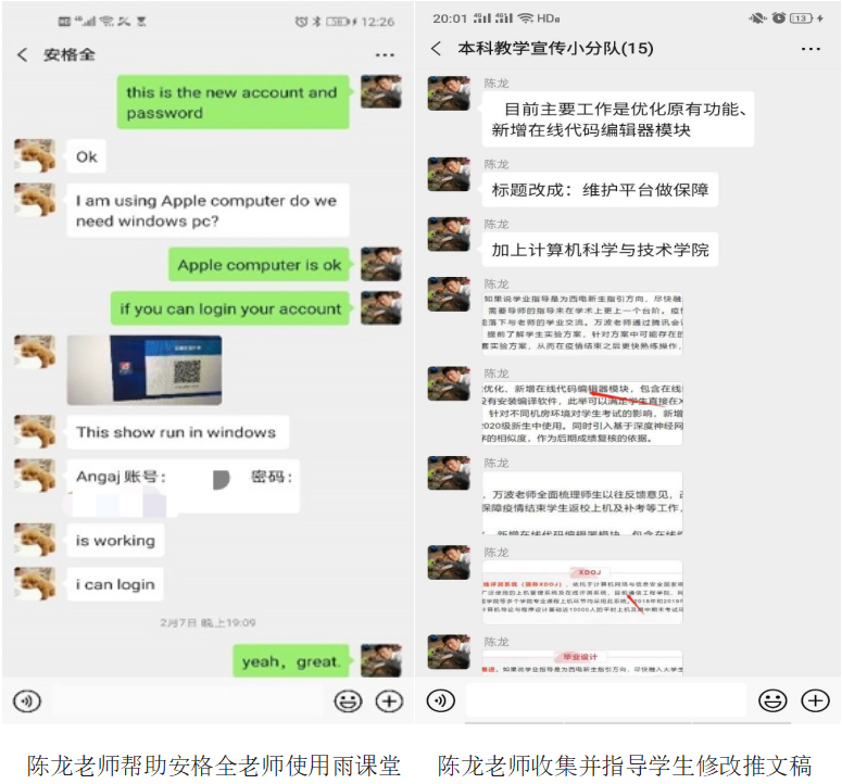 如此大规模的线上教学工作,打得人措手不及。但正因为有这几位可爱的教务老师,​tyc33455cc的线上教学不但秩序井然,而且涌现出多种多样的典型。首先出场的就是我们的陈龙老师,他积极沟通各位科任教师,为他们答“疑”解“惑”,尽全力消灭一切阻碍线上教学的因素。公司有一门外教课程“软件过程与项目管理”,疫情发生时任课教师安老师在印度,陈龙老师迅速与安老师取得联系,带他提前熟悉各类在线学习平台。当得知“学在西电”不能在国外登陆后,又第一时间远程帮助安格全老师安装并测试雨课堂,保证安老师在线教学的顺利进行。他还按照公司总体部署,做好2016级本科生毕业设计中期检查和学籍等各类工作;并主动加入本科教学宣传小组,竭尽所能地贡献自己的聪明才智。