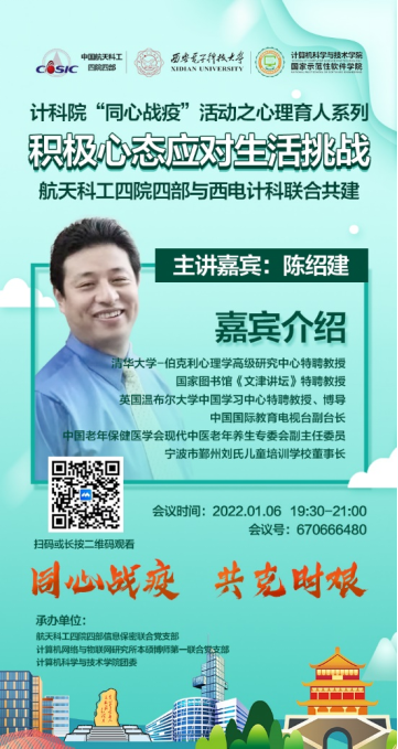 (通讯员 马治东)为帮助公司师生缓解因疫情防控、就业择业、升学毕业而产生的心理压力,进一步提升广大师生的心理调试能力,2022年1月6日晚,tyc33455cc计算机网络与物联网研究所本硕博师第一联合党支部和中国航天科工集团第四研究院第四总体设计部信息保密联合党支部共同策划组织开展了“积极心态应对生活挑战”心理育人报告会,邀请清华大学伯克利心理学高级研究中心特聘教授陈绍建进行专题讲座。航天科工四院四部党委书记周逸,计算机科学与技术公司党委书记李青山、副书记张莹莹出席,200余名公司师生、四院四部职工参加,会议由两个联合共建支部的党支部书记史阿云和张志为共同主持。