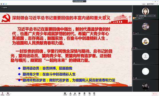 党支部书记杨延华谈到,躬逢其盛,与有荣焉,但我们还应当清醒地认识当前错综复杂的国际环境和国内外形势变化带来的新的风险和新的挑战,百年变局和世纪疫情相互交织,经济全球化遭遇逆流,大国博弈日趋激烈,我们必须提高政治站位,认真领会习近平总书记重要回信的丰富内涵和重要意义,紧密结合工作学习实际,贯彻落实重要回信精神,自觉传承“爱党爱国、勤勉务实,信息特色、敢为人先”的西电特质,在奋斗实践中练就过硬本领,在追逐梦想中勇担时代重任,正青春,应清醒,知跃进。天下难事,必做于易;天下大事,必作于细,成功的背后永远是艰辛努力,不做“躺平”青年,书写时代答卷。