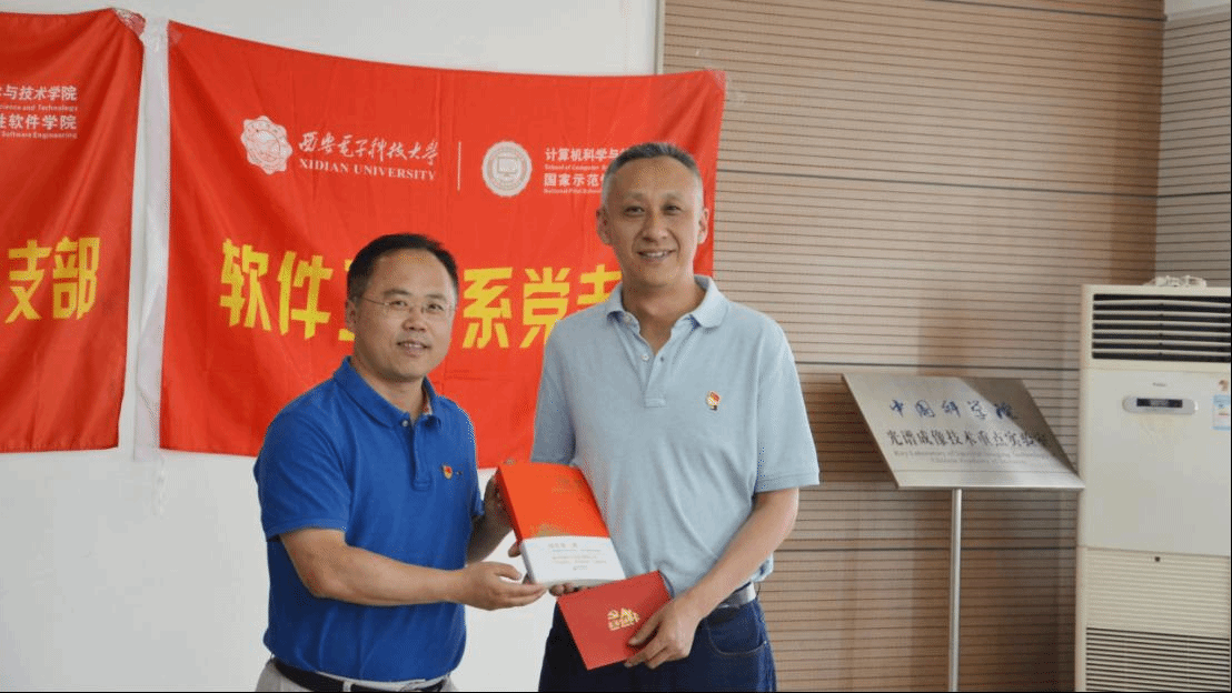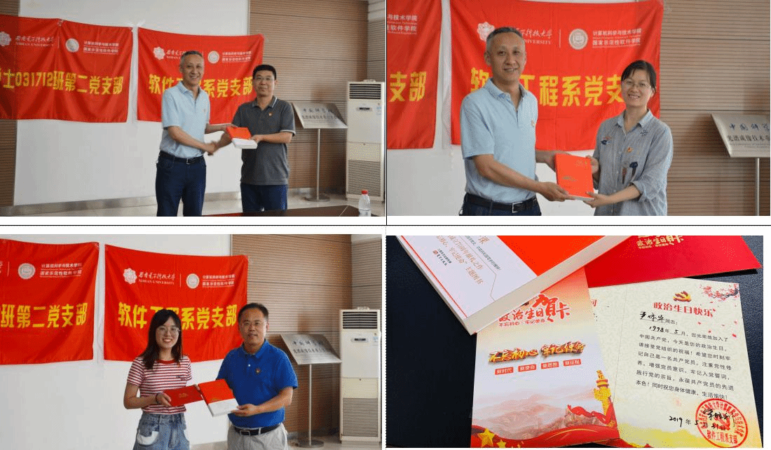 参观学习结束后,全体师生党员在光谱成像技术重点实验室会议室为五月份入党的师生党员过了隆重而又简朴的政治生日。支部书记宋胜利宣读了五名师生党员名单和入党日期,董事长助理王泉、公司党委书记李青山分别为党员送上了软件工程系党支部精心订制的政治生日贺卡和生日礼物——新中国成立70周年献礼之作:《国史第一课》。五月恰逢王泉助理政治生日,李青山代表党支部全体党员为他送上了政治生日贺卡和生日礼物。