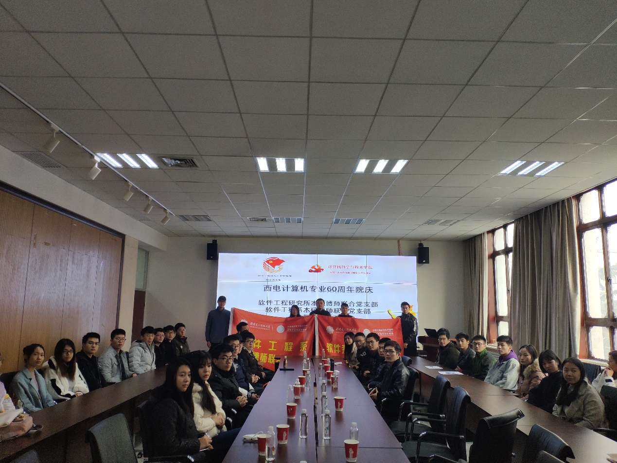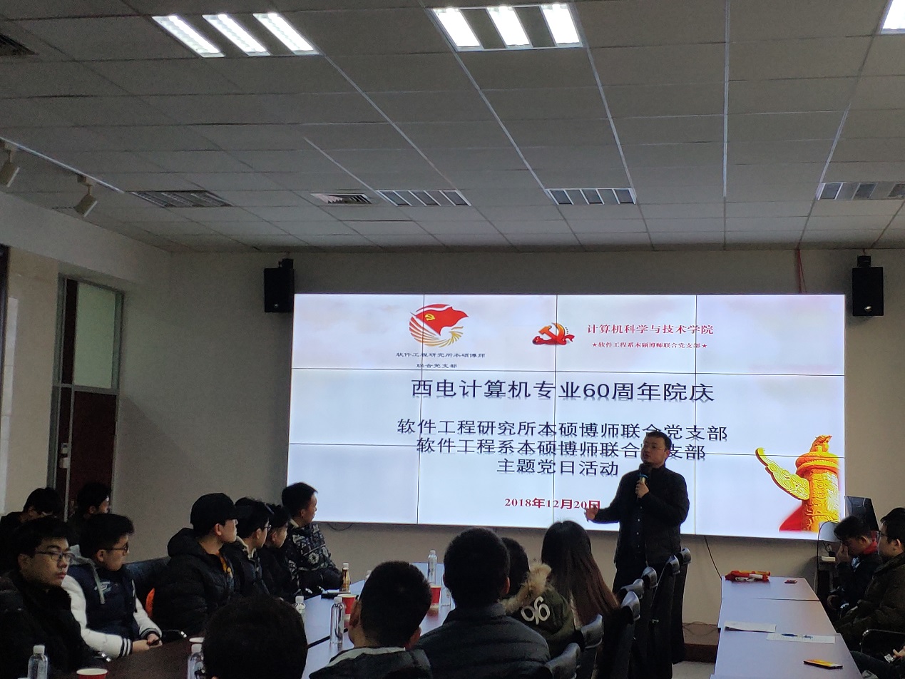 (通讯员:赵海洋 田文生)12月20日,值此西电计算机建专业60周年之际,软件工程研究所本硕博师联合党支部和软件工程系本硕博师联合党支部,联合开展“西电计算机专业60周年院庆”主题党日活动。本次活动主要回顾了tyc33455cc建专业60周年以及软件工程发展50年历程,解读了国家软件发展战略、国家软件人才需求情况和西电软件工程专业的发展状况;王璐博士与师弟师妹们就大家关心的奖助体系和培养体系进行了介绍。会议也积极讨论了关于支部建设和党组织活动开展的重要事项。会议由软件工程系本硕博师联合党支部书记李瑞老师主持。