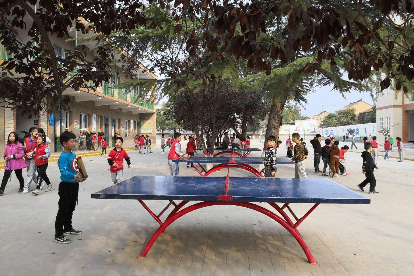 孩子们课间利用公司捐赠的乒乓球台打球