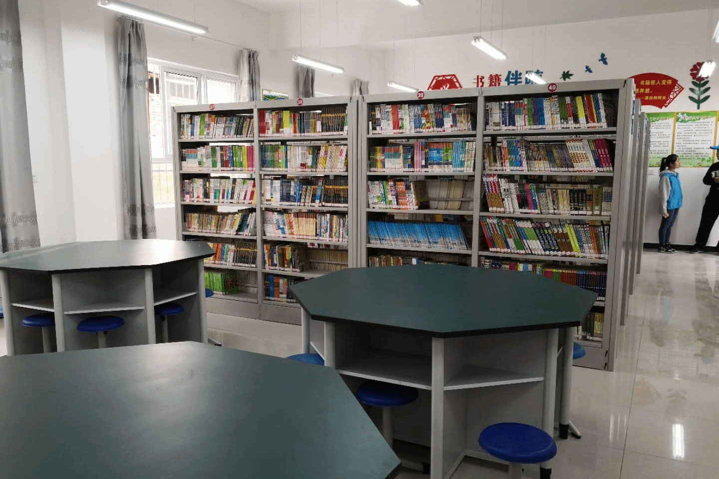 图书室里公司捐赠的书柜摆满书籍
