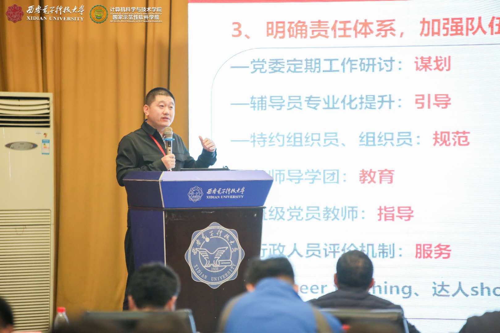 本硕博师联合支部书记张志为结合辅导员到专任教师,普通党员到支部书记的角色转变,表示将立足本职,充分发挥联合支部组织育人优势,做西电育人工作的传承者和实践者。刘向增分享了支部在本硕博传帮带、与教师支部协同开展活动中的具体举措。王璐谈到了支部在强化思想引领、增强科技报国信念方面的理念和实践。