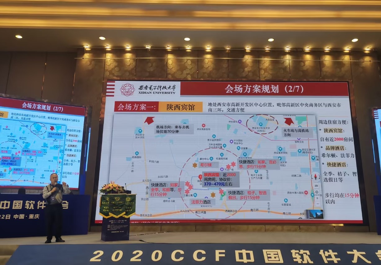 作为大会闭幕式的重要环节,11月22日下午,李青山代表公司、公司与学科,从承办单位概况、会议筹备方案、承办城市环境三个方面向各专委会常委以及参会代表阐述了CCF中国软件大会2021的筹备方案。在承办单位概况部分,李青山介绍了西电的发展历史与学科特色,总结了西电软件工程学科的发展历程与学科团队,回顾了举办过的软件工程领域的相关会议,阐明了西电软件工程学科与国内软件工程学科的紧密关联。接下来,李青山在介绍以往学科团队办会经验的基础上,给出了会场方案的规划,并从接待水平、设施设备、住宿条件、地理交通、周边环境等多个维度对可能的会场方案进行了综合分析。之后,李青山向与会代表简要介绍了承办城市西安在文化、科教、交通等方面的良好环境。