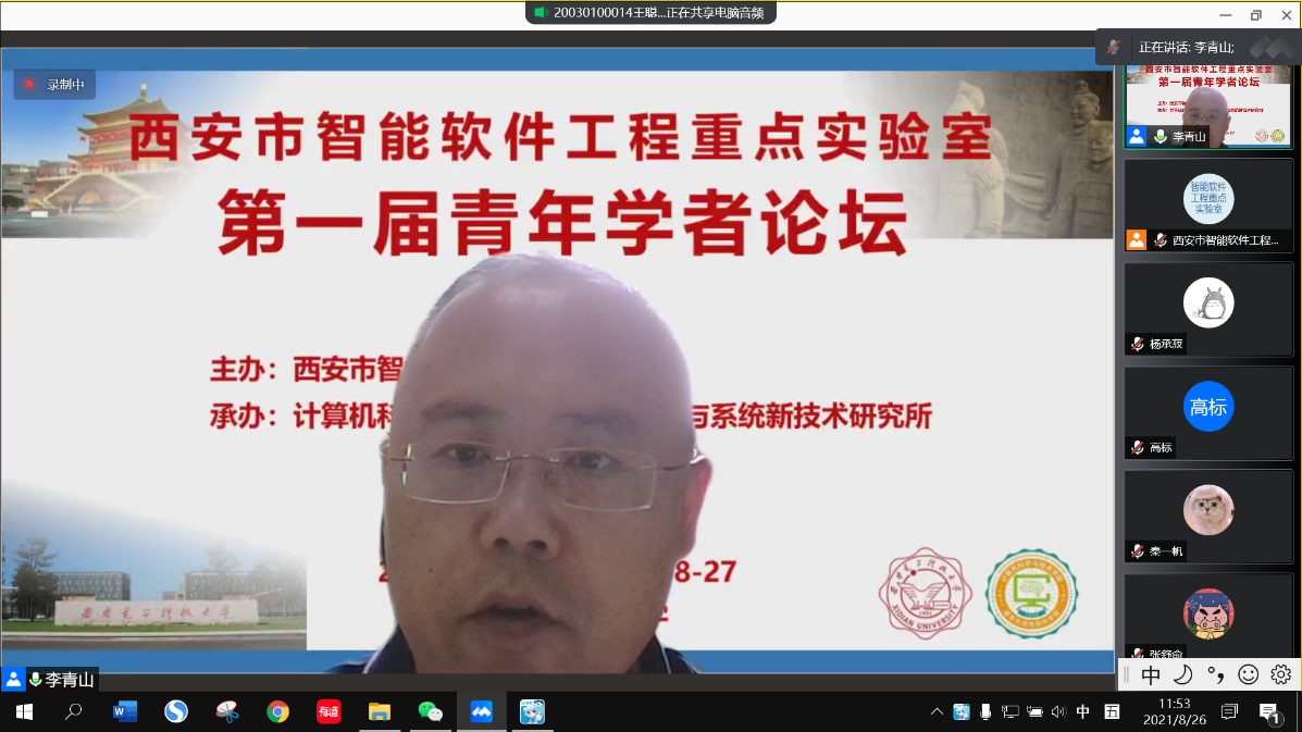 论坛开幕式由tyc33455cc软件工程学科负责人、计算机科学与技术公司党委书记、西安市智能软件工程重点实验室主任李青山教授致辞。李青山简要介绍了本次论坛的情况,对各位报告嘉宾和在线听众表示热烈欢迎,并从两个方面强调了本次青年论坛预期达到的目标。一方面借助论坛,围绕智能软件与智能系统相关问题与进展,进行广泛的学术交流与研讨,让西电以及国内相关领域师生在学术研究、自身发展等方面有收获、有进步。另一方面,通过论坛加强不同公司间相关领域青年教师的交流与学术互动,为领域内青年教师的成长提供一个良好的平台。