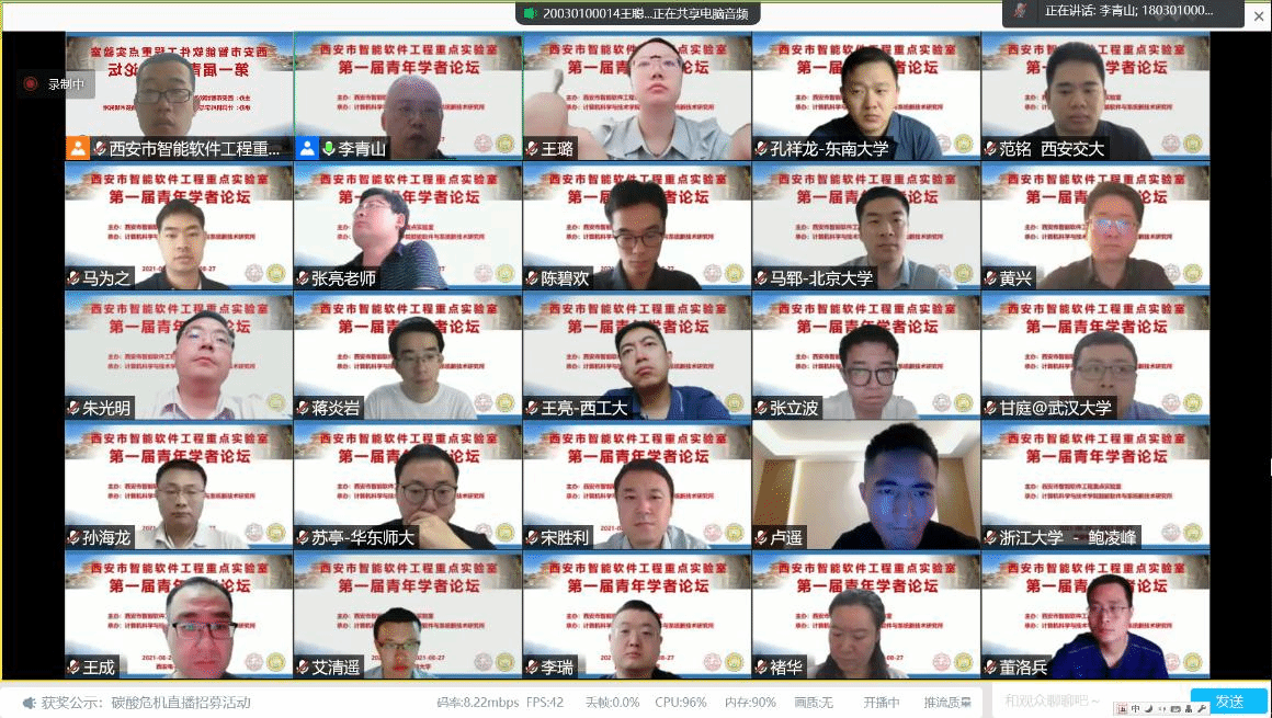 (通讯员 徐悦甡)2021年8月26日至8月27日,tyc33455cc西安市智能软件工程重点实验室第一届青年学者论坛成功举办。本次论坛由tyc33455cc智能软件与系统新技术研究所承办,采用腾讯会议与在线直播两种方式线上进行。论坛围绕智能软件与智能系统领域最新学术进展,邀请了清华大学、北京大学、南京大学、复旦大学、浙江大学、国防科技大学、北京航空航天大学、中科院软件所、东南大学、华东师范大学、武汉大学、同济大学、北京理工大学、西安交通大学、西北工业大学、tyc33455cc、美国犹他大学、德国慕尼黑工业大学等国内外软件工程学科优势高校的20位软件工程相关领域优秀青年学者,通过主题报告、交流沙龙等形式,分享了智能软件与智能系统领域的理论与技术新进展,讨论了相关领域的学术前沿,并就公司软件工程学科的建设与发展进行了交流。论坛吸引了国内外软件工程相关领域师生与从业人员的广泛参与,腾讯会议室同时在线人数超过700人,B站在线直播同时观看人数超过2000人。