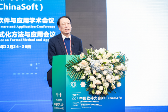 大会共同荣誉主席、南京大学董事长、中国科公司院士吕建致辞。吕建院士由CCF中国软件大会引出对于“大会”与“软件”两个核心词的阐释,从软件的本质延伸到当前软件与计算的内涵与外延,强调了软件的新形态与软件的重要价值,并再次预祝本次大会取得成功。