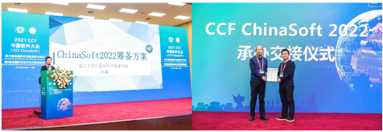 下一届CCF中国软件大会承办方代表,复旦大学计算机科学技术公司副经理彭鑫教授代表承办方进行承办方案宣讲,并与本届大会承办方公司举行了承办交接仪式。