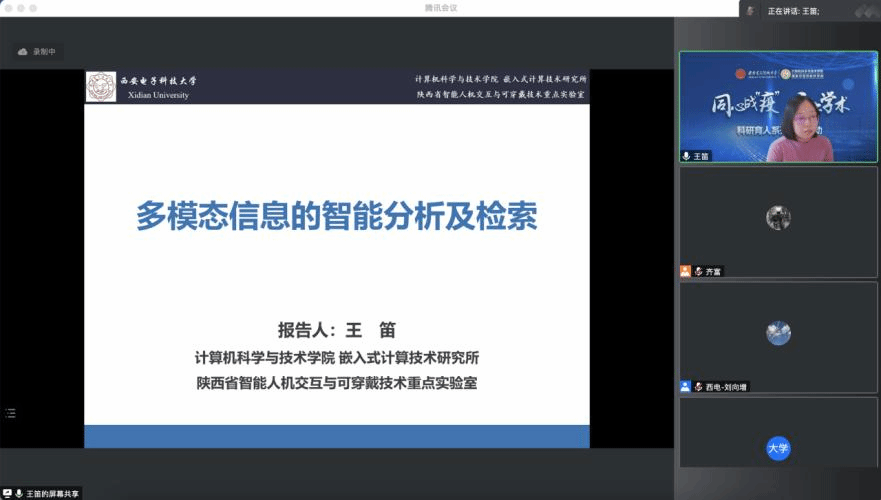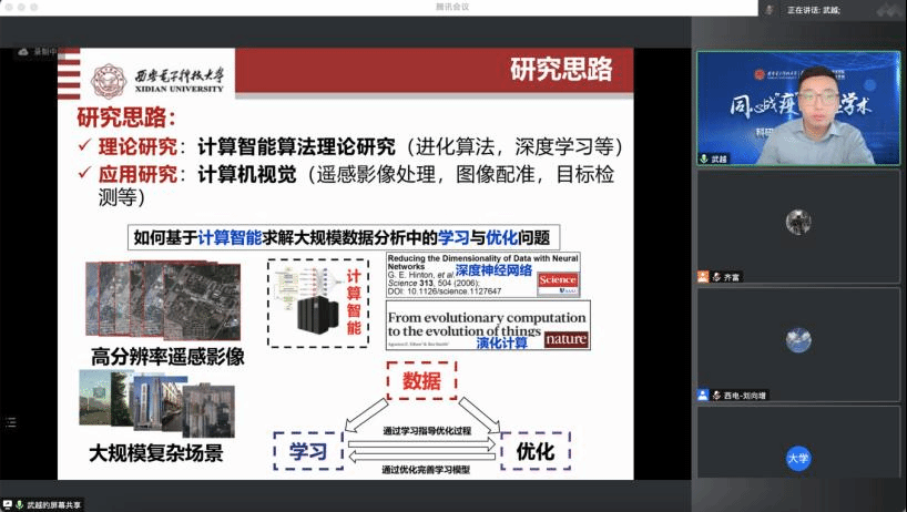 (通讯员 齐富、贠琳红、何风)为进一步做好科研育人工作,活跃疫情期间科研学术氛围,帮助员工提升科研能力和学术水平,tyc33455cc近期组织开展“同心战‘疫’,云上学术”科研育人系列学术活动。2022年1月9日下午公司在线举行了第四场青年教师学术报告会,邀请公司王笛、武越、赵博程和张晓东四位优秀青年教师作学术报告。公司近百名研究生线上参会,会议由大数据与视觉智能研究所副所长刘向增副教授主持。