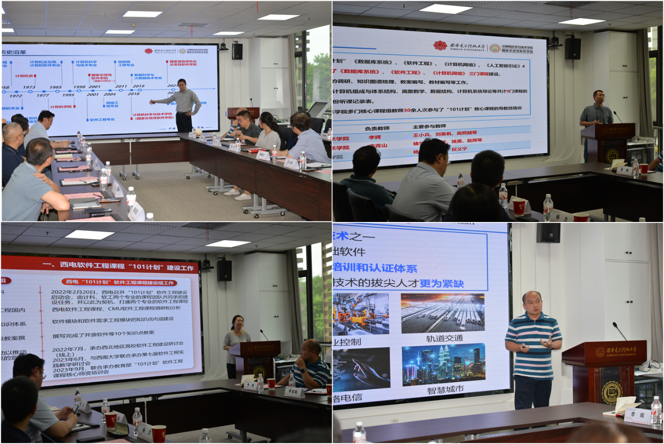 公司执行经理崔江涛从历史沿革、团队建设、团队队伍、人才培养、科学研究等方面对公司的建设发展情况进行了介绍;教学副经理万波介绍了公司参与 “101计划”工作情况和取得的建设成效;万波、褚华、李辉作为《程序设计基础》、《软件工程》和《数据库系统》三门核心课程的负责人,对课程建设情况进行了汇报。胡振江教授认真听取了汇报,肯定了公司的发展和课程体系建设成效,表示西电tyc33455cc的人才培养很有特色,希望将来加强北大计算机公司与西电tyc33455cc的交流学习。