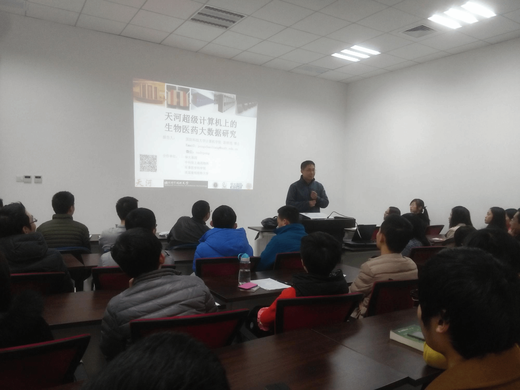 彭绍亮博士首先向大家介绍了银河系列超级计算机和天河系列超级计算机的发展历程,以及天河超级计算机天河2号一期的应用---算天算地算人。这些先进的科学技术都与大家的生活息息相关。彭博士还介绍了国防科技大学软件研究所与华大基因、中科院上海药物研究所、英国曼彻斯特大学等单位的合作项目。同时,彭博士还向我们展示了天河系列超级计算机在天津、长沙、广州等多个城市和国家超算中心的部署情况,以及它们在基因工程、药物设计等领域发挥的巨大作用。彭博士指出,随着高性能计算技术在商业领域的普及应用,以及大数据分析技术和工具的出现,生物医药行业迎来了更为广阔、更具想象力的成长空间。报告会结束后,彭绍亮博士就相关学术问题与在场师生进行了深入的交流和互动。
