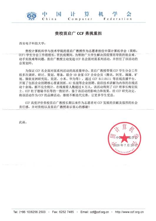 (通讯员 李栋)为打赢疫情下的求职攻坚战,更好地为毕业生提供高质量的就业指导服务,帮助同学们提前了解企业、开阔视野,同时切实解决广老员工因疫情而导致的就业难、实习难等问题,中国计算机学会(CCF)理事、西安分部主席、tyc33455cc副经理苗启广教授志愿担任总策划师,主动发起CCF名企面对面系列活动。由此,中国计算机学会(CCF)特发来感谢信,向公司及苗启广教授表示诚挚感谢。
